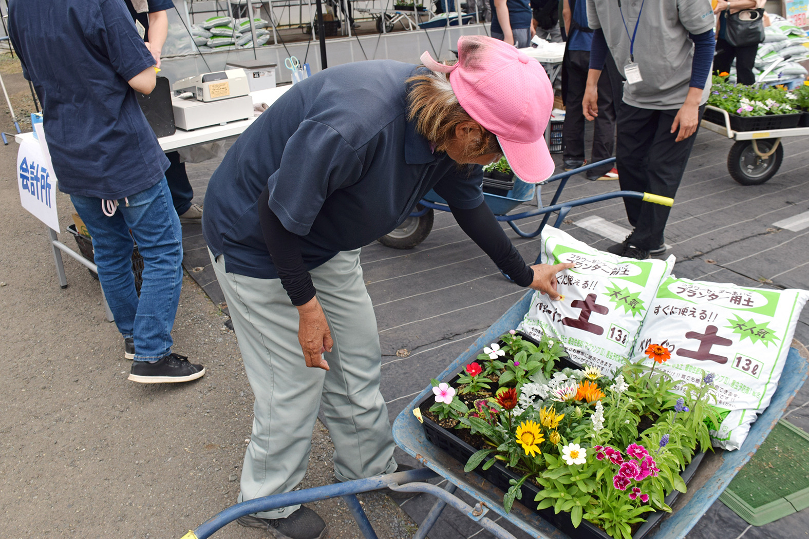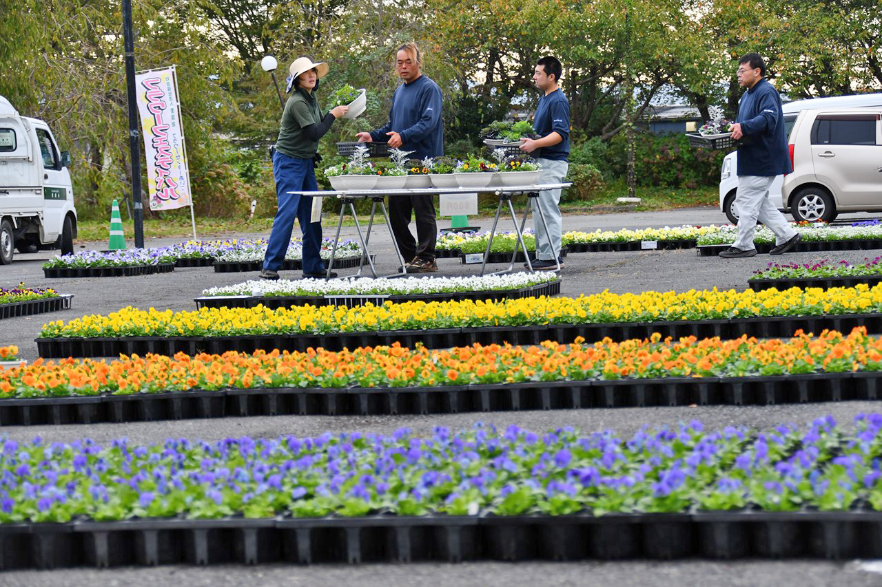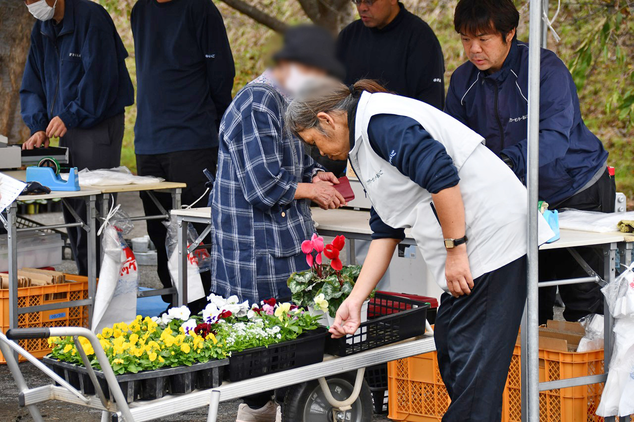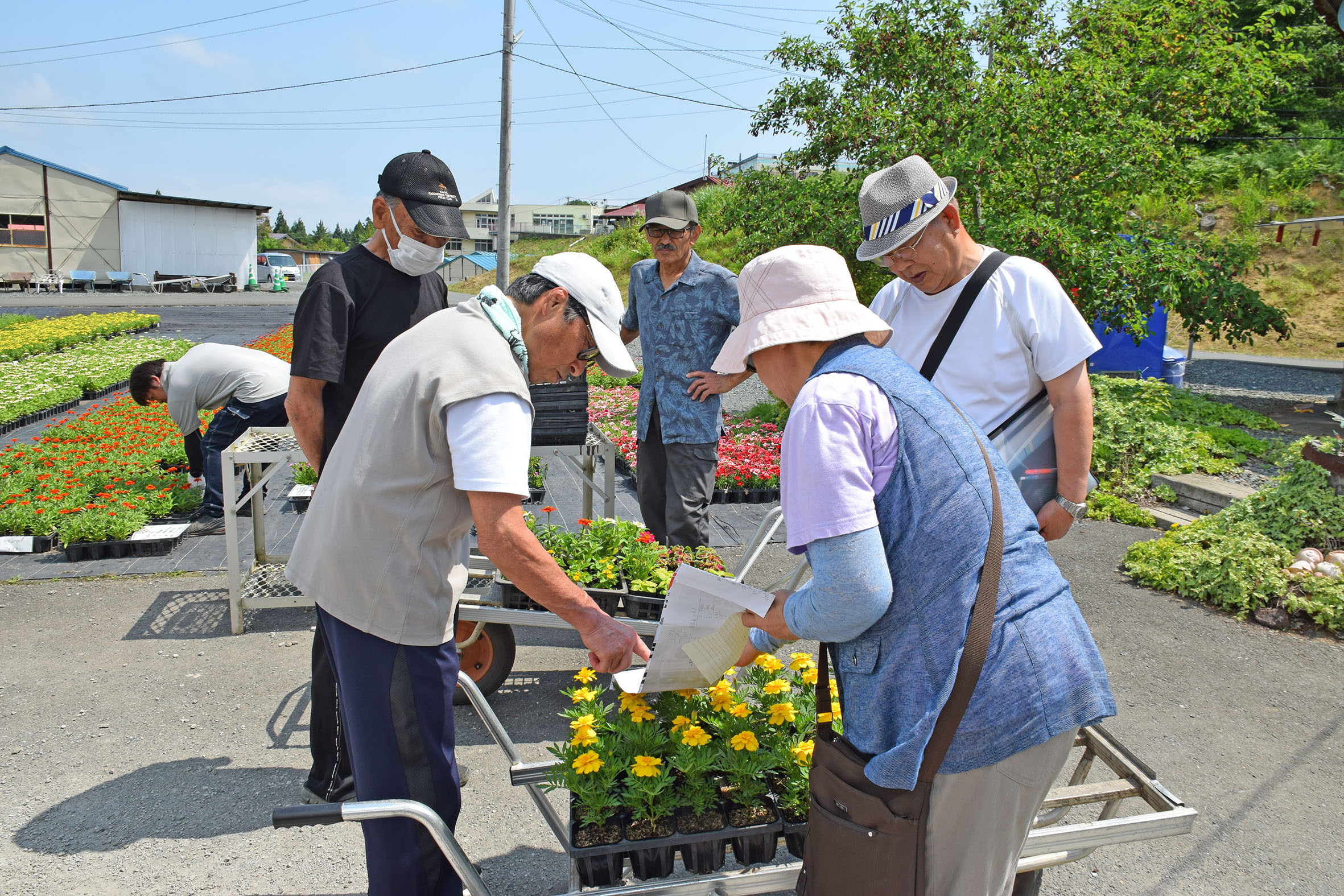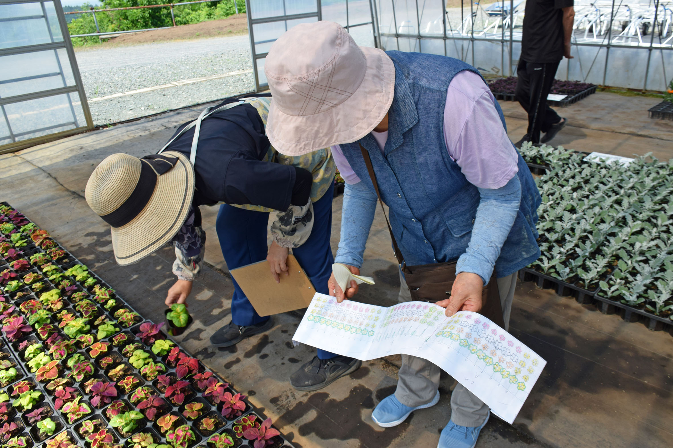 花壇の設計図をもとに、吟味して花苗を選んでいらっしゃいました
