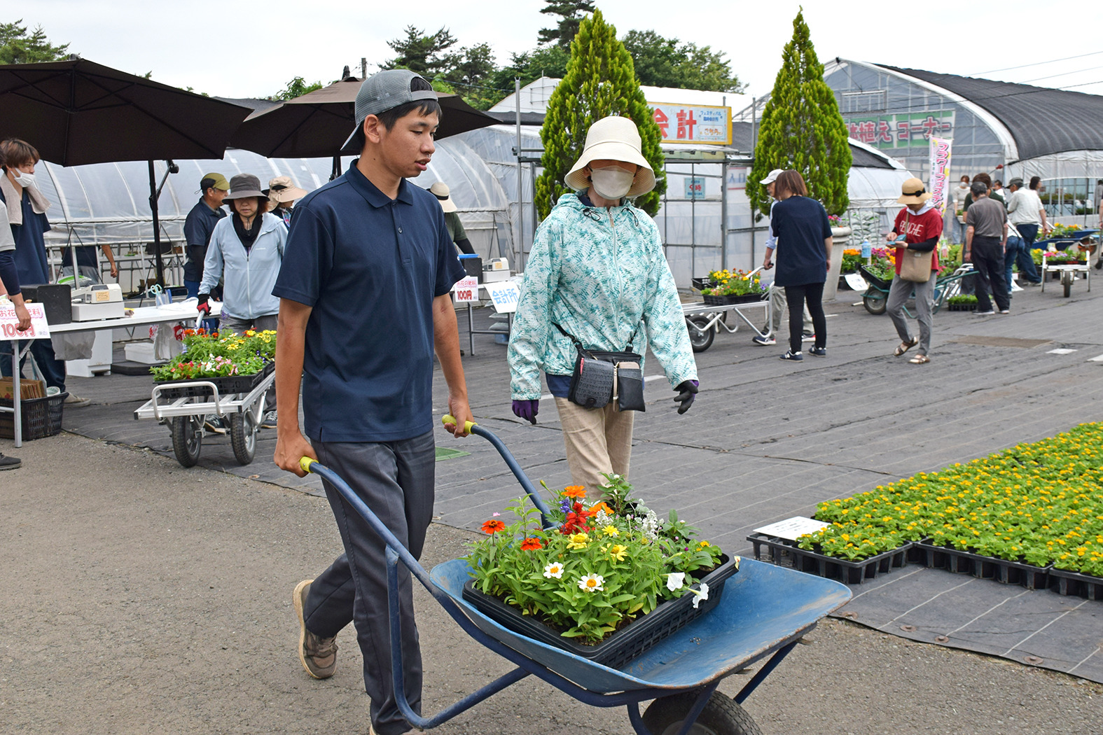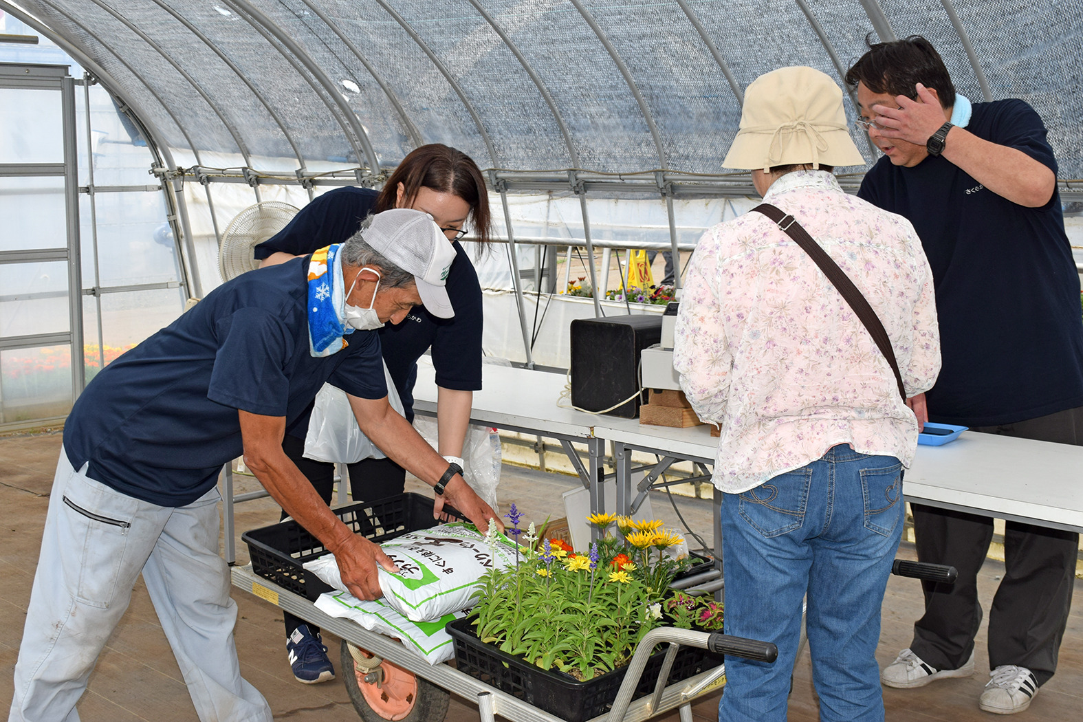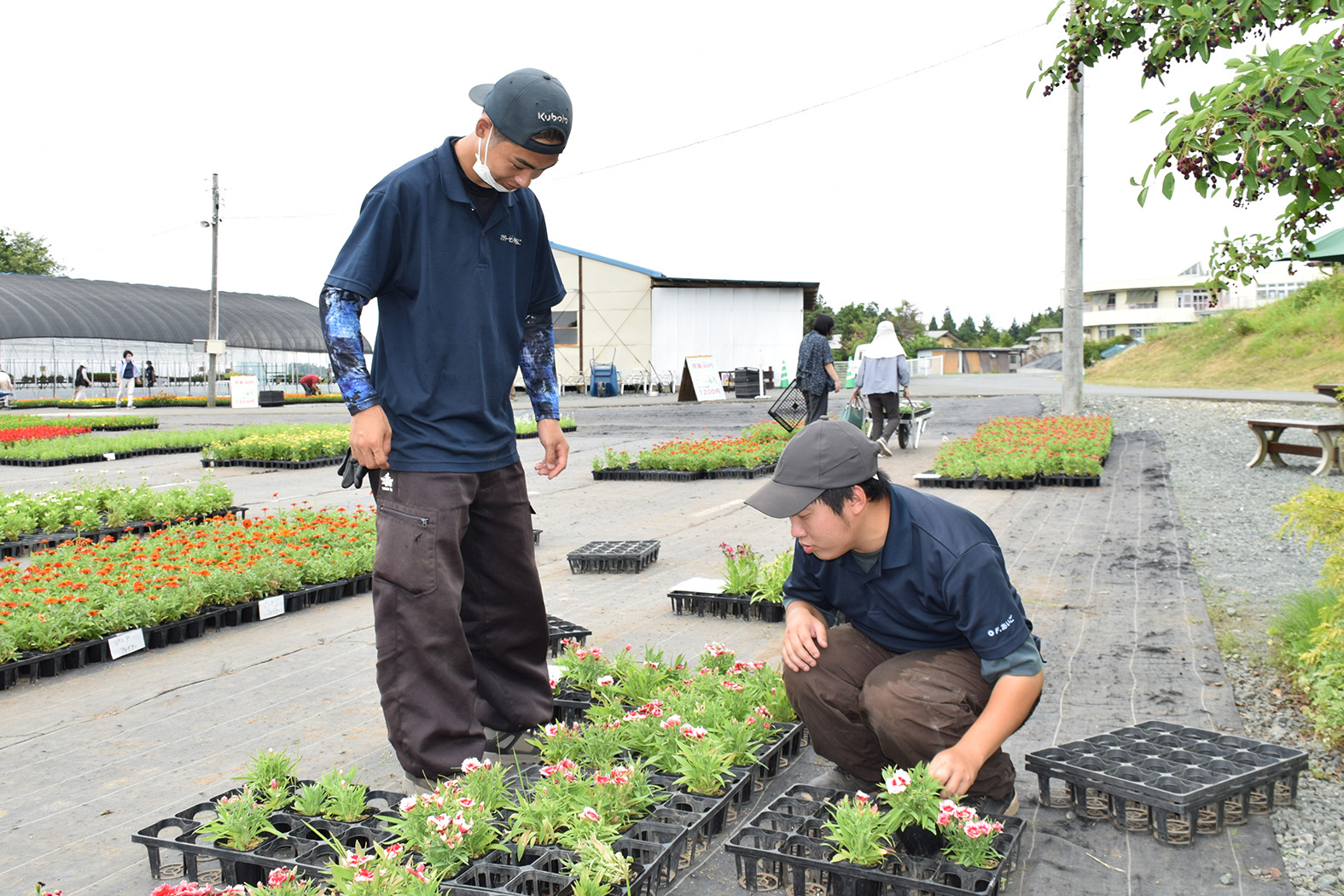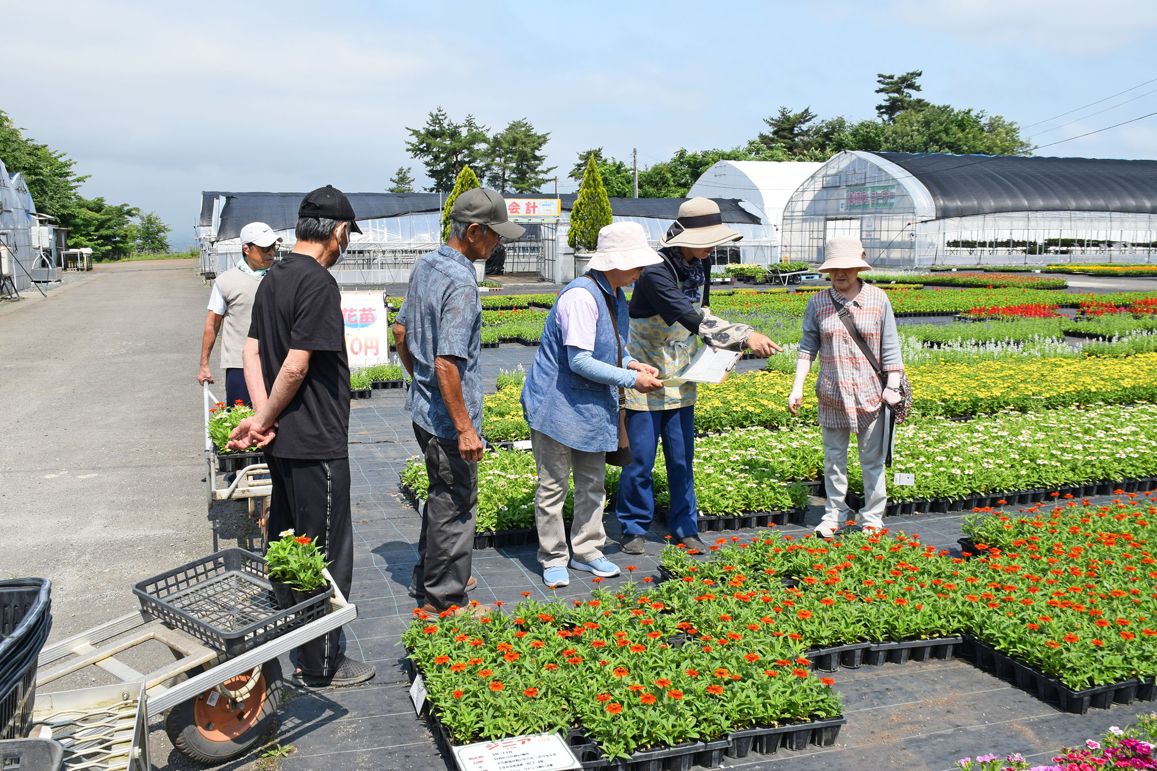 花壇の設計図をもとに、吟味して花苗を選んでいらっしゃいました