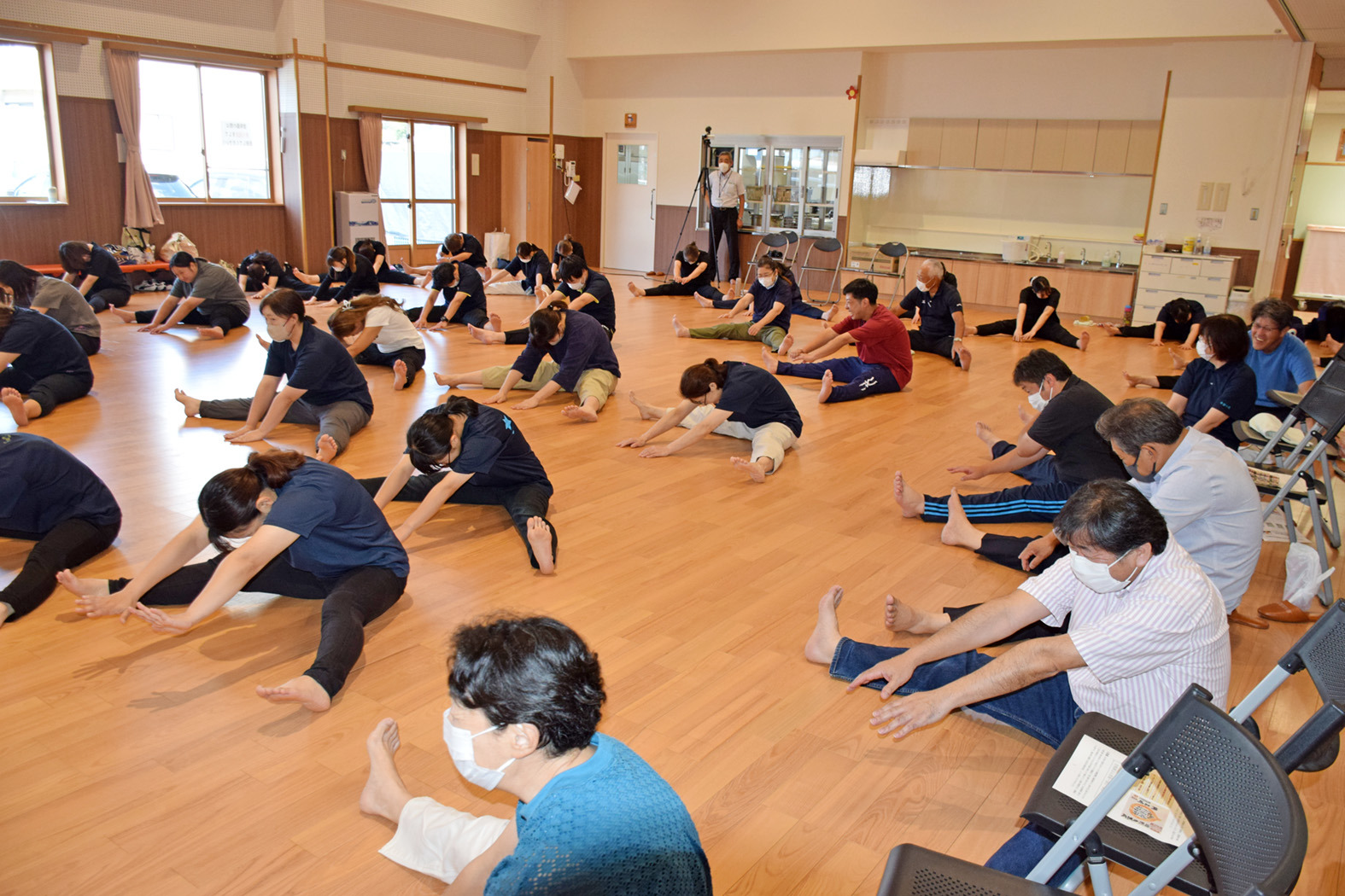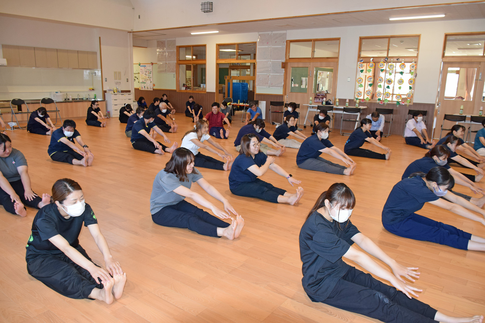 会場で挑戦した職員の中には、前屈や開脚に苦戦している方も…![]()